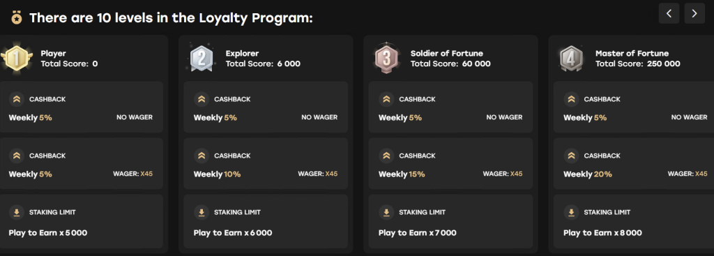 Fairspin ass e Schrëtt weidergaangen an huet veralteten, dacks onduerchsichteg Loyalitéitssystemer, déi vill Konkurrenten nach ëmmer benotzen, ofgeschaf. Mir hunn dëst duerch eng dynamesch a fair 10-stufeg Loyalitéitsleeder ersat, déi direkt op Ärer Spillaktivitéit an de gespillte Beträg baséiert. All Kéier wann Dir d’Rollen dréint oder eng Wett ofgitt, verdéngt Dir Punkten, déi Iech an der VIP-Ranking no uewe bréngen.